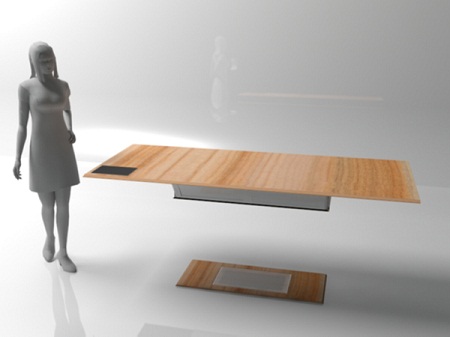 si tratta di un tavolo ispirato ai treni a levitazione magnetica, il tavolo infatti non avrà nessun supporto fisso ma rimarrà sospeso grazie ai magneti, con la possibilità di regolarne l’altezza.